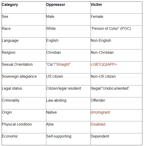 In most of the above categories there are variations that can increase the intensity of oppressor or victim status. For example, certified victimhood in a recognized category confers extra points, like Black Lives Matter for race (it is racist to suggest that “all lives matter”) or a defined religious group marginalized by “hate” (mainly anti-Jewish or anti-Muslim, but not something like anti-Buddhist, anti-Rastafarian, or even anti-atheist or anti-Satanist because no one bothers about them; anti-Christian victimhood is an oxymoron because “Christian” is inherently an oppressive category). In addition, meeting the criteria for more than one category confers enhanced victimhood under a principle called “intersectionality.”