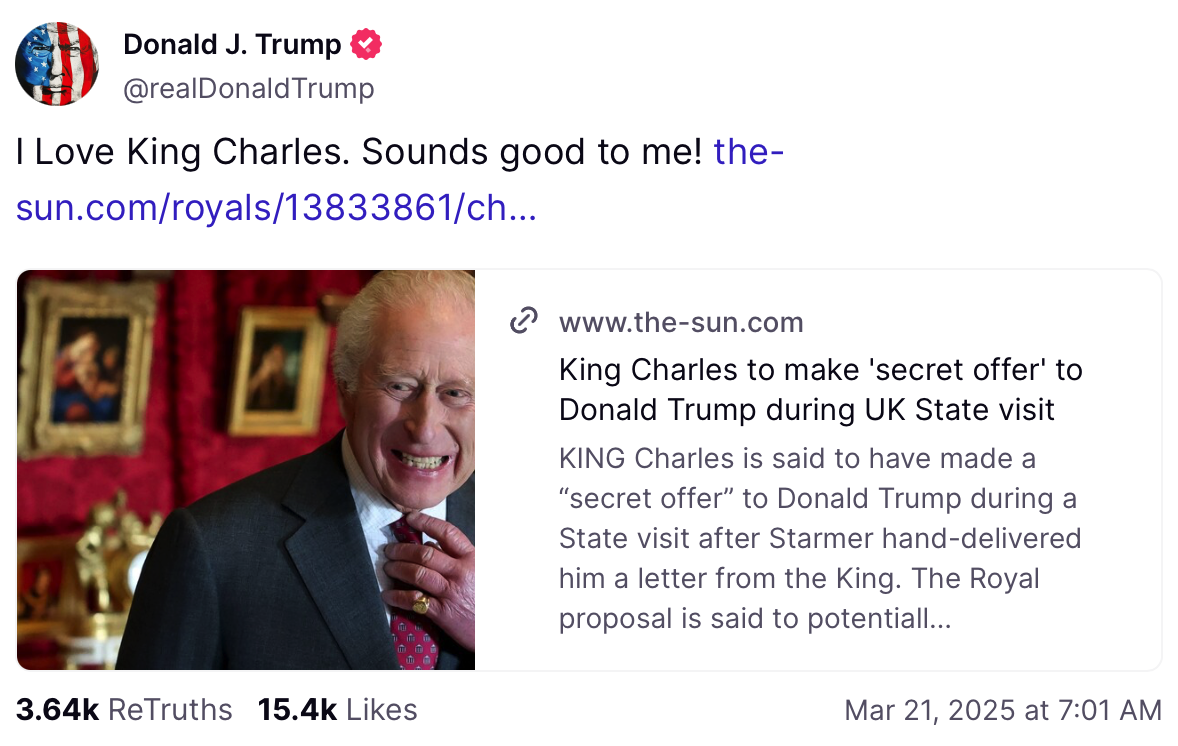 On Truth Social, Trump linked to the story that I quoted above and he posted a very enthusiastic message…