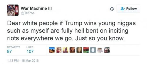 “Dear white people if Trump wins young niggas such as myself are fully hell bent on inciting riots everywhere we go. Just so you know,” Poe tweeted. A screenshot of his since deleted tweet was captured below by the Daily Media.