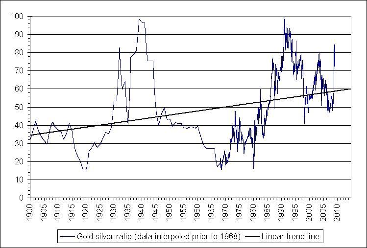 – In the last 25 years (since 1985) the mean silver:gold ratio has increased to 66.9:1